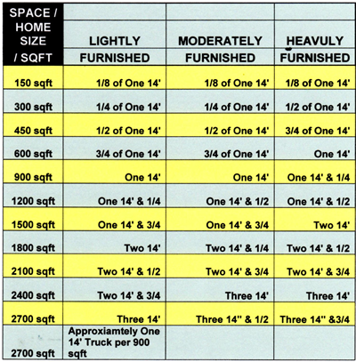 Our calculator gives you a more accurate idea of space used per 14’ Truck Load. Be sure to include the contents of all rooms and spaces. Don't forget the garage, attic, basement, and closets. Please note this calculator isn’t optimized for mobile and is best used on a desktop computer. Remember that this matrix is an estimate only. 5.